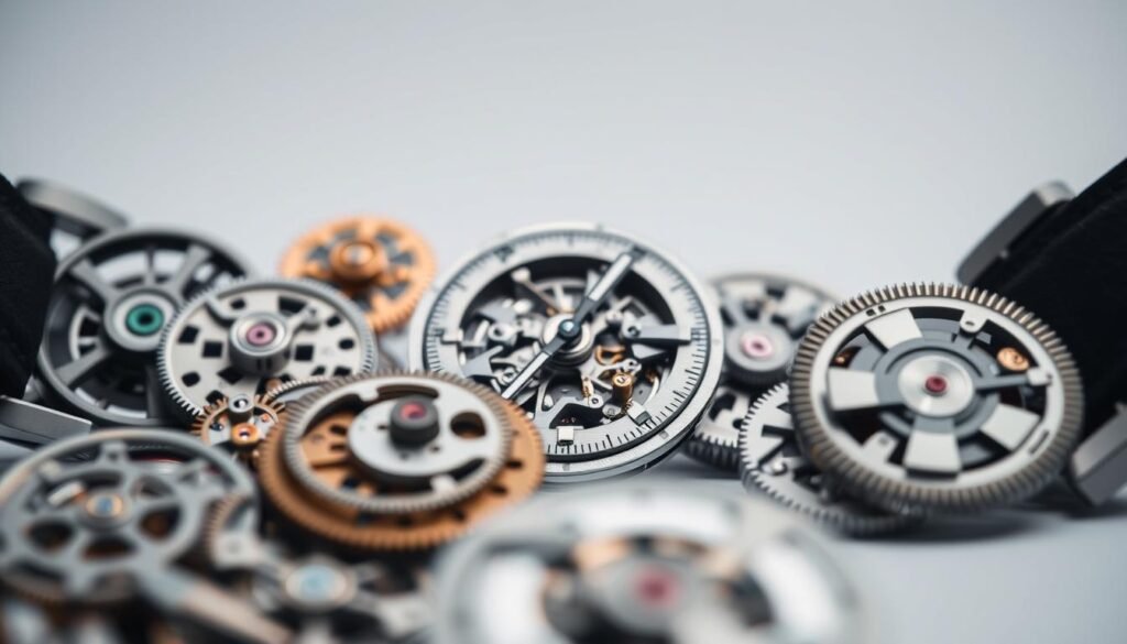At the heart of every mechanical watch is a complex system. It works together to keep accurate time. These components are key to the watch’s function, showing the skill in making mechanical movements. A watch’s power reserve is important, showing how long it can run without winding.
